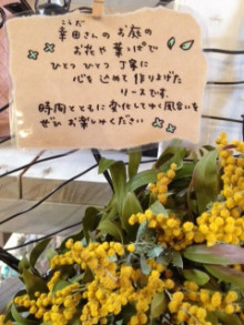 手作りリース 2014年3月21日リードあざみ野 コメントする こんにちは。てづかです。 今日は、ご好評いただいております、幸田さんの手作りリースの ご紹介です ミモザの鮮やかな黄色い花が、とても爽やか 春を感じます とても良い香りがします。 ひとつひとつが、心のこもった一点ものです ご自宅の玄関やリビングにいかがですか? LEAD 共有: X で共有 (新しいウィンドウで開きます) X Facebook で共有 (新しいウィンドウで開きます) Facebook いいね 読み込み中… 関連
